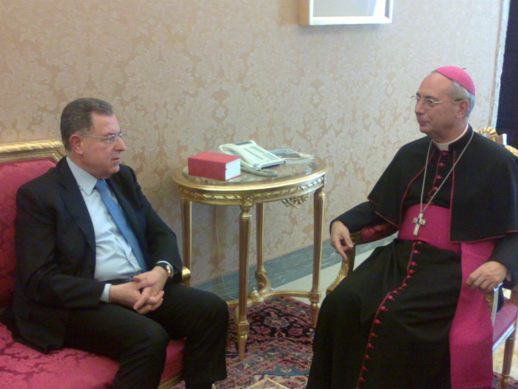 استقبل وزير خارجية الفاتيكان المونسنيورة دومينيك ما. مبرتي، ظهر اليوم في مكتبه في الفاتيكان رئيس كتلة المستقبل، الرئيس فؤاد السنيورة على مدى ساعة